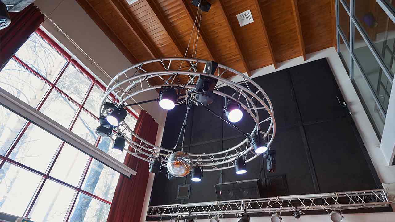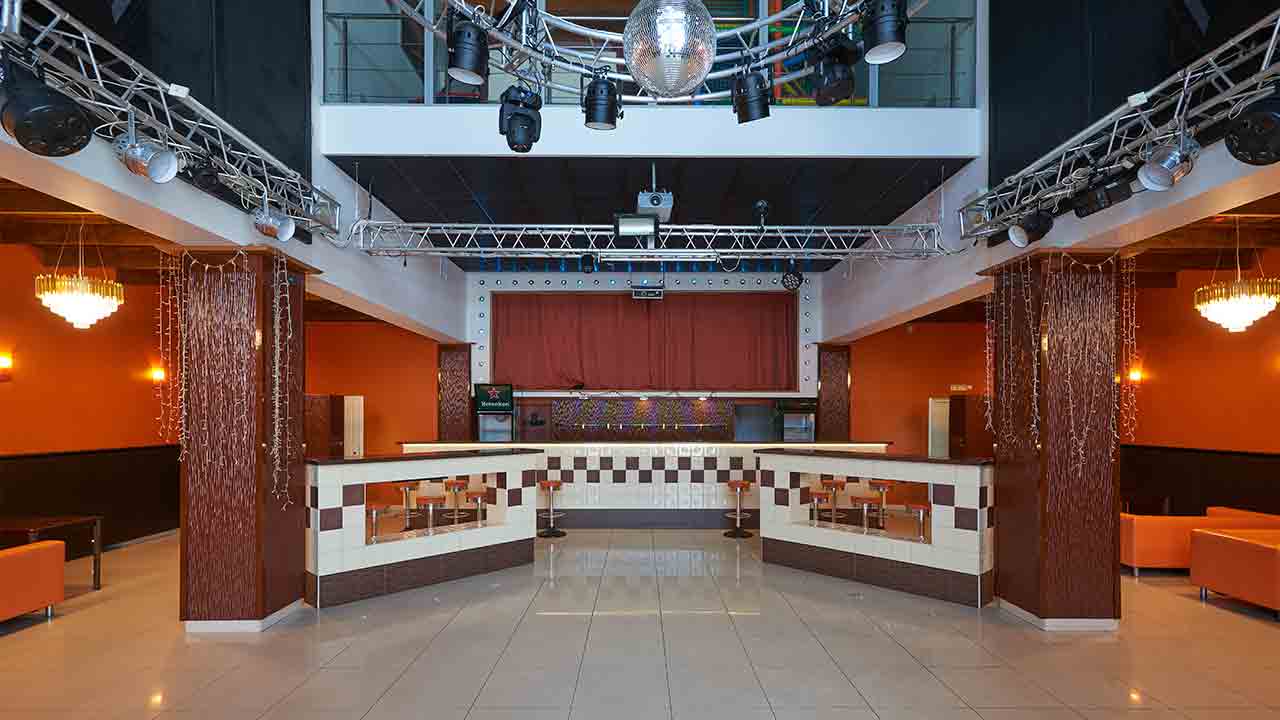 Возможно переоборудование зала для проведения банкета, фуршета или конфиренций, с комфортным размещением до 70-ти гостей. Имеется изолированная сцена, звуковое и световое сценическое оборудование, а также оборудование для проведения мультимедийных представлений и презентаций; спутниковое телевидение;прекрасный вид на озеро и природу из гигантского витражного окна.